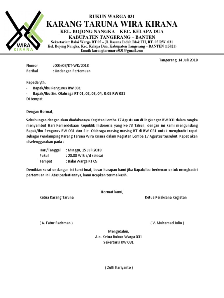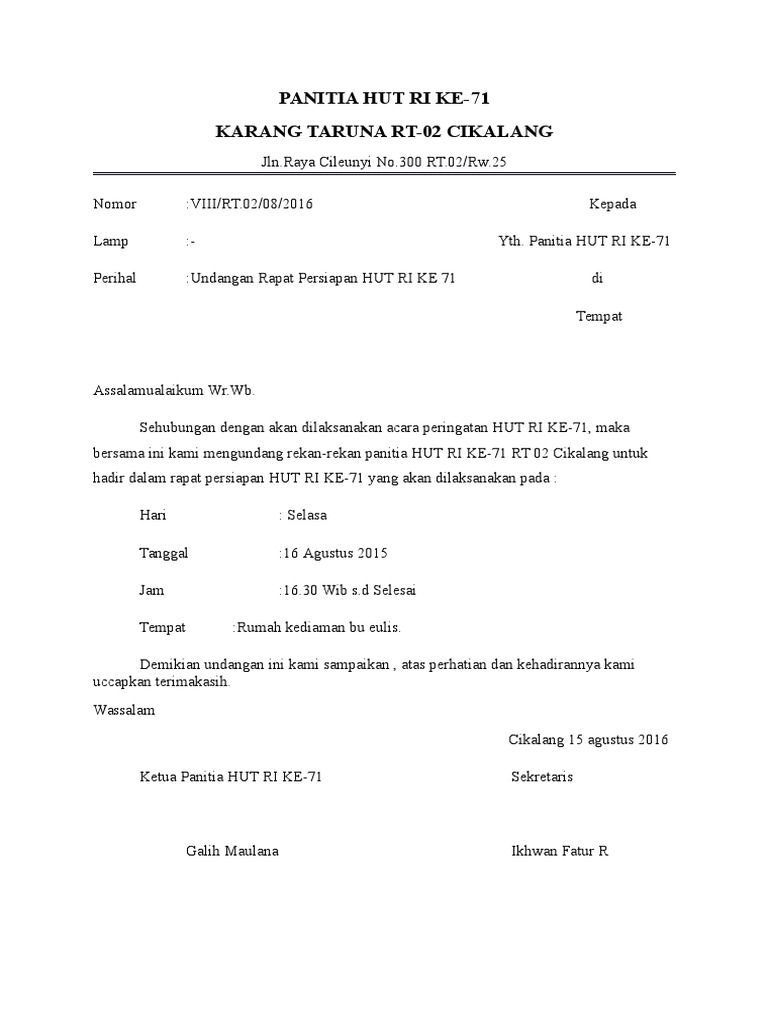 Sehingga memudahkan koordinasi antar oraganisasi karang taruna maupun kepada instansi. Contoh surat undangan rapat sekolah. Contoh proposal 17 agustus tingkat rt. Surat undangan resmi pada berbagai kegiatan yang resmi sebagai manfaat dan referensi membuat surat undangan resmi yang profesional. Tentu menjadi sebuah organisasi memerlukan adanya sebuah administrasi yang resmi.