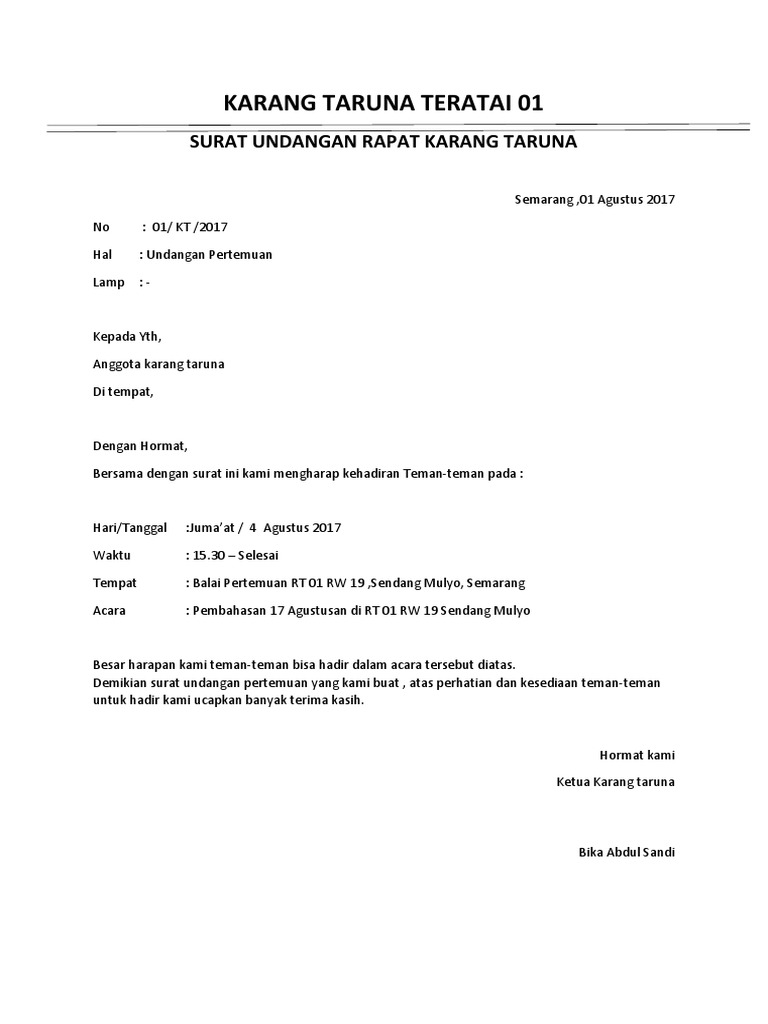 Contoh surat undangan rapat resmi. Bisa digunakan untuk persiapan acara 17 agustusan atau acara resmi lain. Dinas pendidikan kebudayaan pemuda dan olah raga. Contoh surat undangan rapat pembentukan pengurus karang taruna. Kami mohon partisipasi dari seluruh warga rt 01 tanpa terkecuali untuk ikut mensukseskan semua agenda acara.