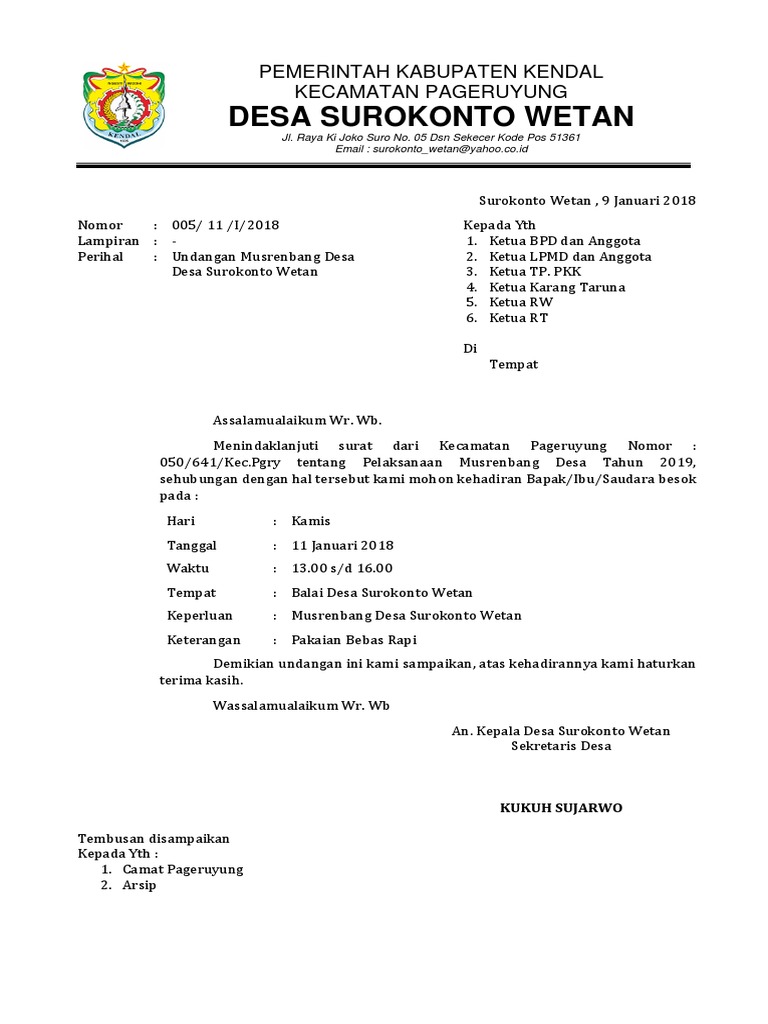 Contoh Surat Undangan Rapat Desa Doc Sample Surat Undangan from i0.wp.com Di kesempatan kali ini dosenpintar.com akan membagikan artikel mengenai tentang contoh surat undangan yang meliputi. Dengan hormat, sehubungan dengan akan diselenggarakannya acara upacara adat tahunan desa mlati, diperlukan beberapa persiapan demi kelancaran acara tersebut. Jika kita terjemahkan bebas surat undangan adalah ajakan, pemberitahuan, permintaan surat undangan sendiri terbagi menjadi dua jenis salah satunya adalah surat undangan umum dan surat undangan individual, seperti contoh. Surat undangan adalah salah satu surat yang memuat ajakan kepada seseorang atau kelompok untuk menghadiri kegiatan tertentu. Pernahkah anda mendapatkan surat undangan yang resmi yang dikirimkan dari lembaga atau instansi tertentu? Nah, surat resmi biasa digunakan untuk tujuan acara yang resmi, sedangkan. Pengurus karang taruna bina warga desa puyung kec. Namun pada pembahasan kali ini, kami tampilkan 5 contoh surat undangan yang sering digunakan dalam khalayak umum dari sekolah sampai perusahaan, desa, dan mahasiswa.